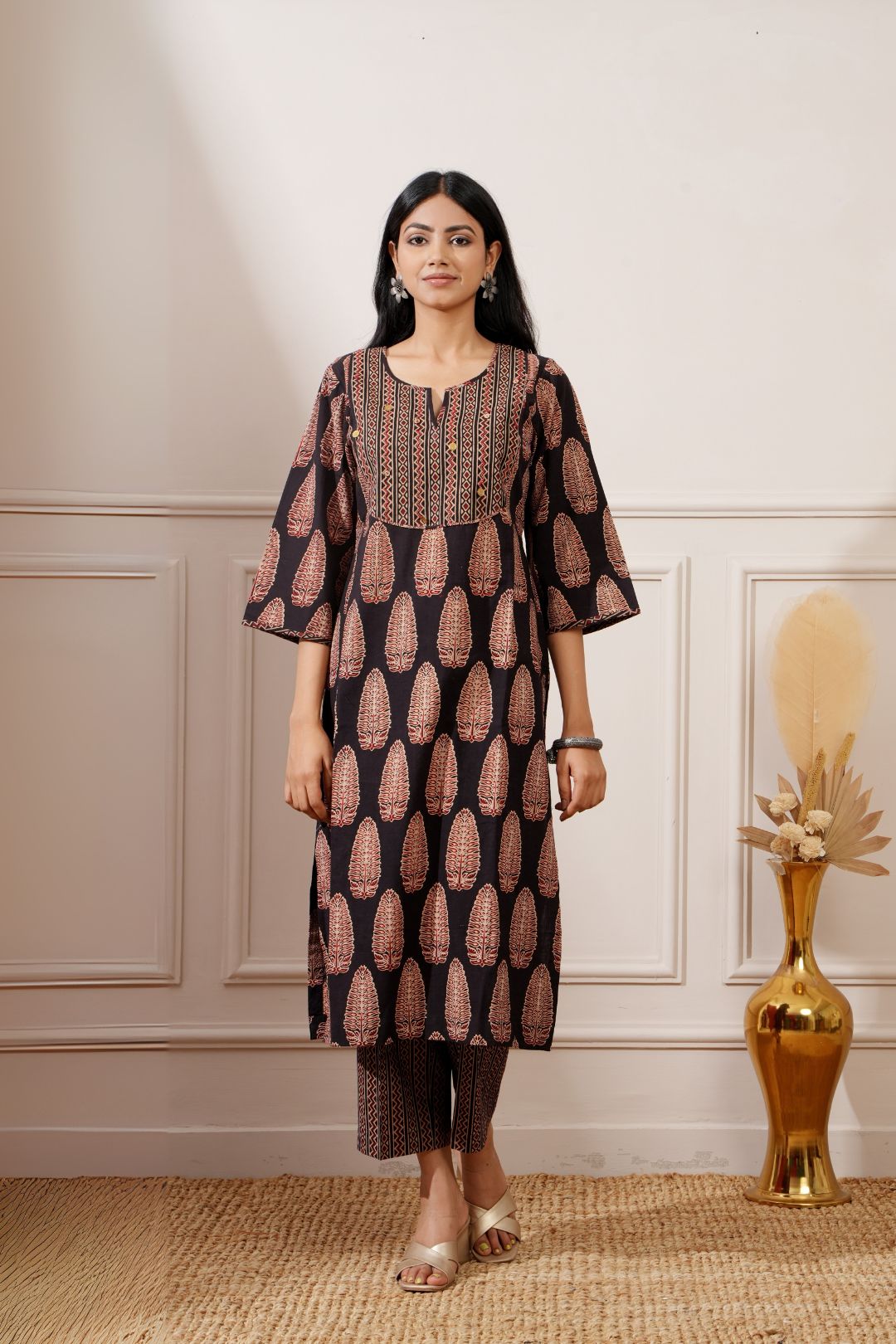 Brimming with elegance and poise, this Black cotton Bagru print kurta set celebrates heritage with modern flair. Styled with a round neck V-cut and hand embroidery details.