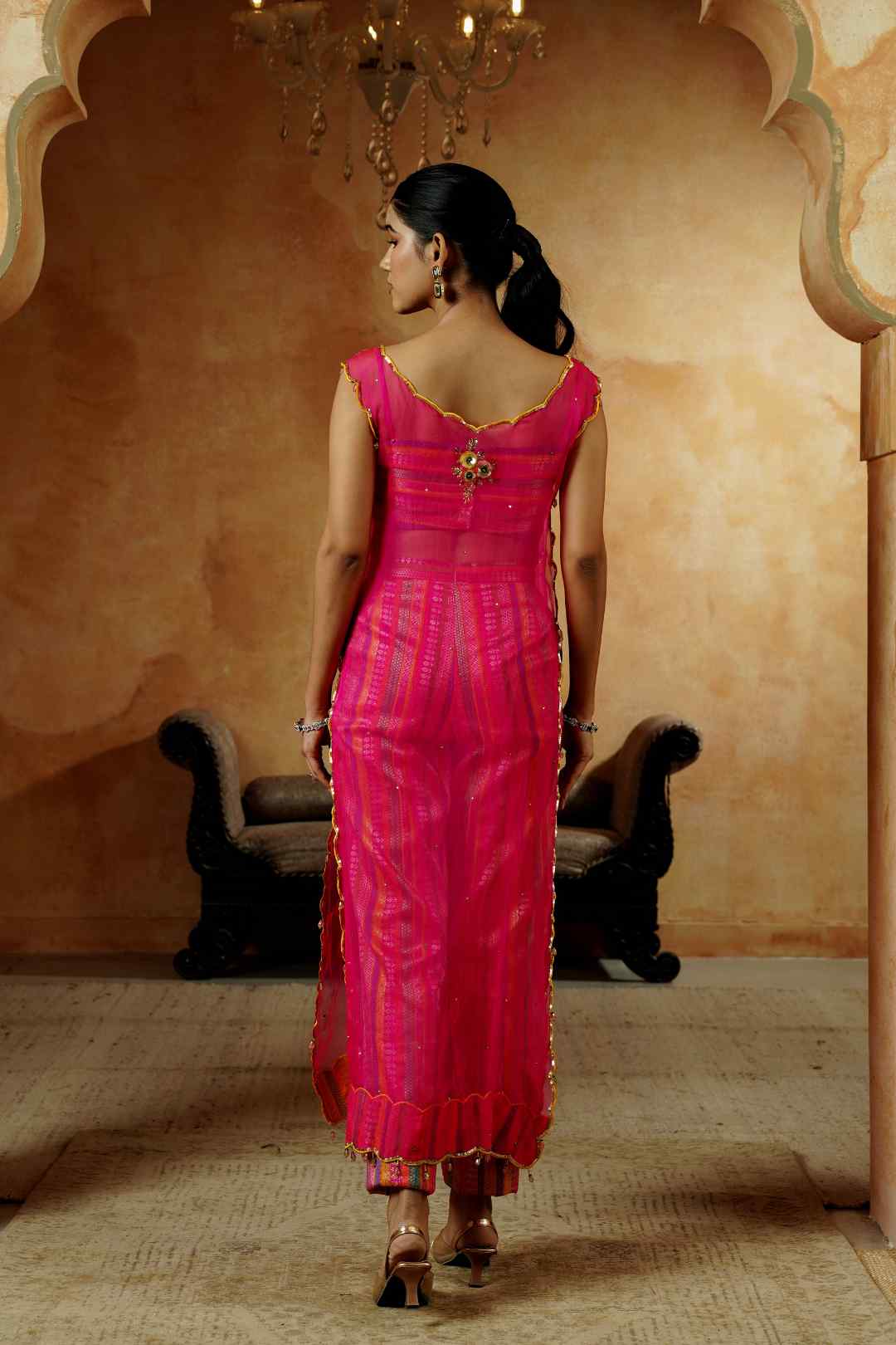 Celebrate joyful moments with our Magenta Embriodered Kurta Set — a playful yet elegant ensemble crafted in a striking hot pink hue. The sheer kurta features delicate golden sequin accents and floral applique detailing along the neckline and sleeves, adding a hint of sparkle and femininity.
