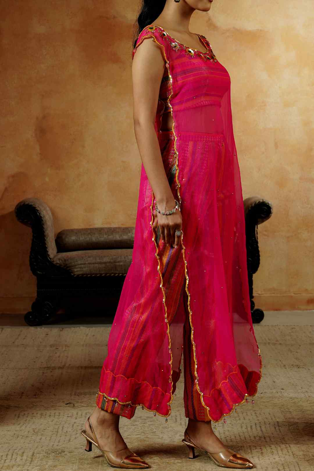 Paired with contrasting striped pants in shades of pink and gold, this breezy silhouette is perfect for daytime festivities, haldi ceremonies, or vibrant mehendi functions. The scalloped hemline with mirror embellishments adds a touch of fun to this fresh and youthful look.