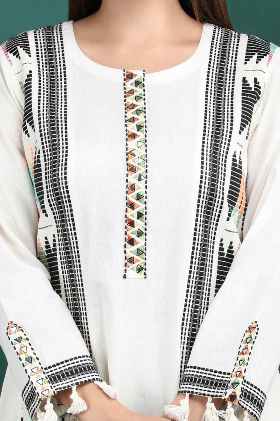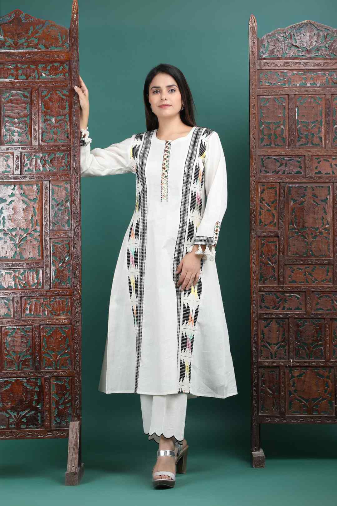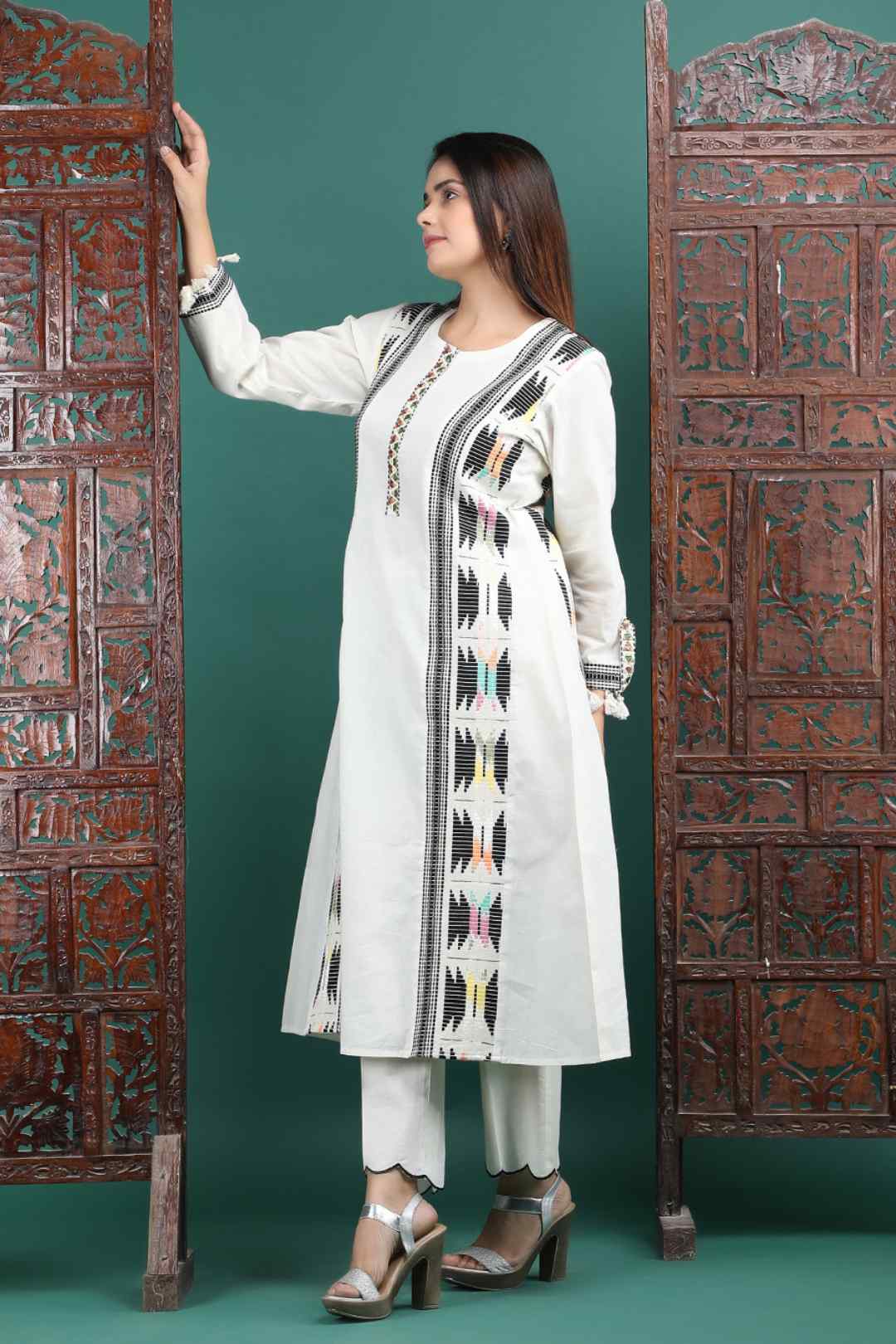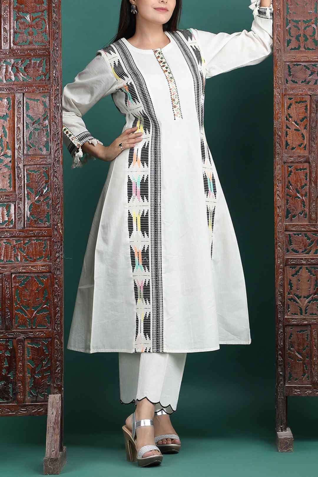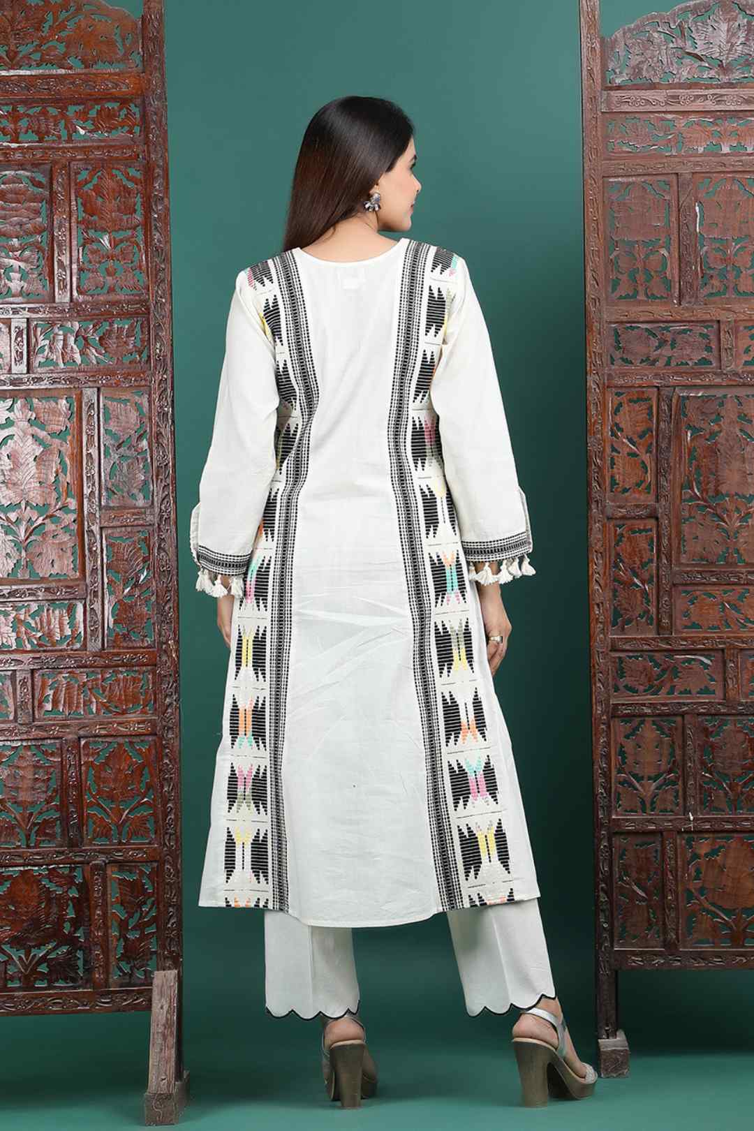 Timeless and elegant, this Off-White Cotton A-Line Kurta is designed to make a statement. Featuring a striking black woven panel, it is adorned with delicate hand embroidery on the neck and sleeves for a touch of artisanal charm. Tassel detailing on the sleeves adds a playful twist, while the scalloped pants complete the look with effortless grace. Perfect for both casual and festive occasions.