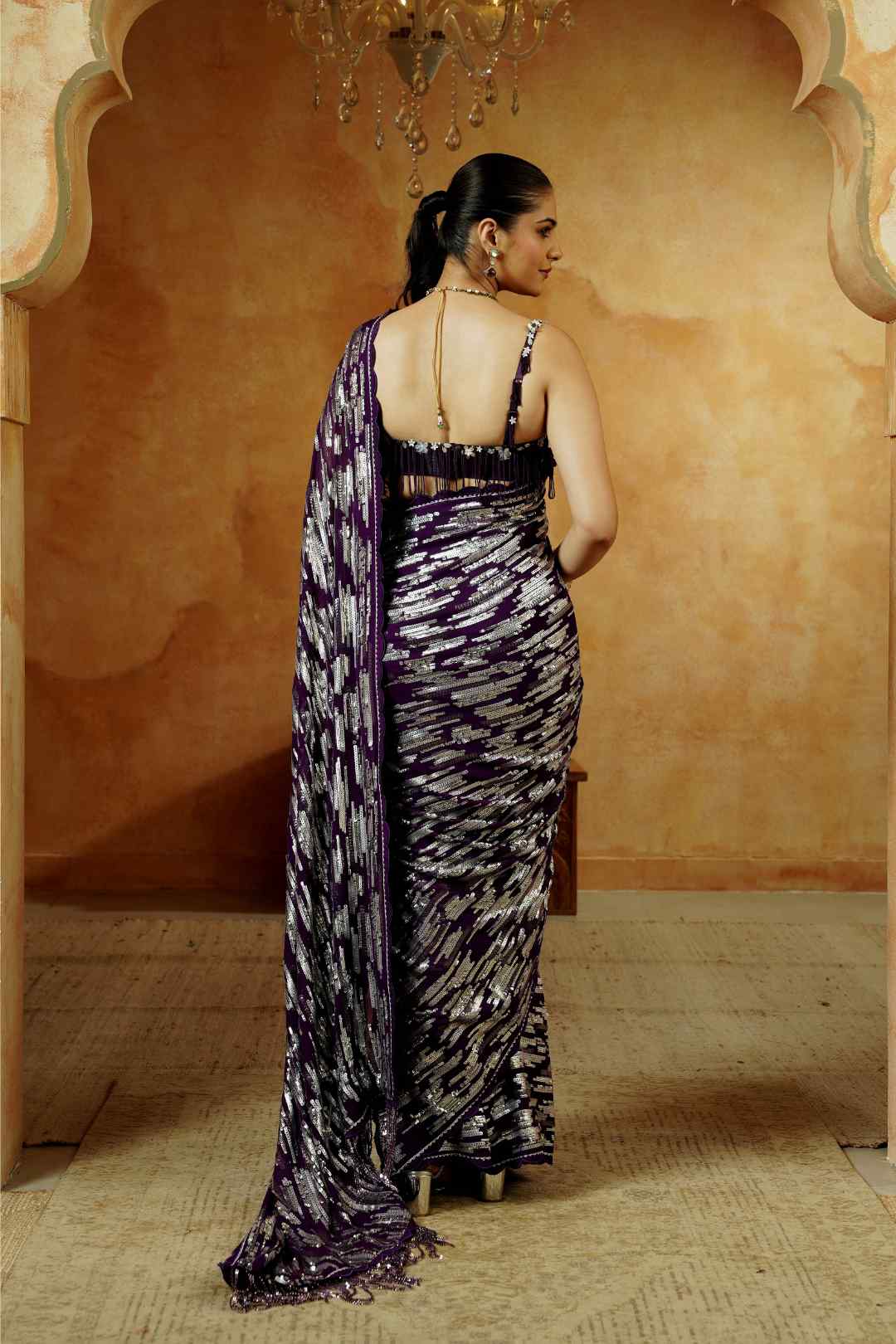 Drape yourself in regal elegance with our Royal Royal Purple Sequin Embellished Saree Set. This captivating saree is a perfect blend of contemporary glamour and traditional craftsmanship. The rich purple base is adorned with striking silver sequin work in an abstract pattern that cascades beautifully, creating a radiant shimmer with every movement.